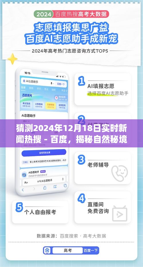 摘要:據預測,百度實時新聞熱搜將在2024年12月18日聚焦自然秘境的探索之旅。屆時,人們將共同關注自然美景的奧秘,探尋未來之旅的心靈歸宿。這一天的熱搜將展現對自然環境的深度探索與發現,同時揭示人類與自然和諧共生的溫馨港灣。讓我們共同期待這一天的精彩新聞與探索之旅。