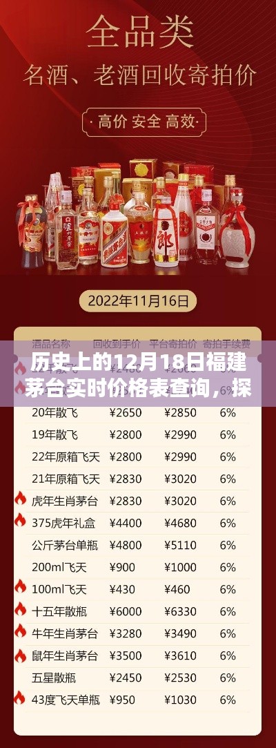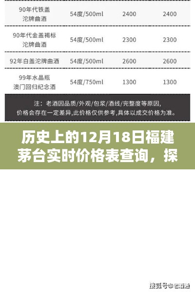 摘要:,,歷史背景中的福建茅臺,在每年的12月18日這一天,其價格變動引人注目。通過實時價格表查詢,揭示福建茅臺的神秘面紗。探尋茅臺的歷史深度,感受小巷中的美酒奇緣。本文旨在分享福建茅臺的價格動態,讓讀者了解這一歷史時刻的美酒故事。