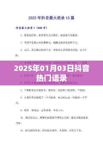 隨著科技的飛速發展和社交媒體的普及,抖音等短視頻平臺已經成為人們獲取信息、娛樂休閑的重要渠道,在抖音上,一些經典、富有哲理的語錄時常成為熱門話題,引發網友們的廣泛討論和共鳴,本文將為大家帶來2025年1月3日抖音上的熱門語錄,讓我們一起感受這些話語的魅力。