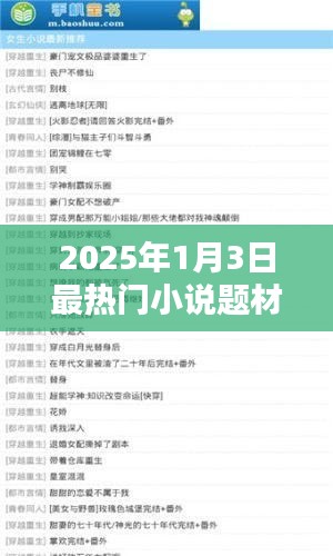 2025年1月3日最熱門的小說題材包括奇幻冒險、科幻未來、歷史傳奇、都市異能、言情小說、懸疑推理、青春校園和武俠江湖等,這些題材的小說各具特色,滿足不同讀者的閱讀需求,是當代文學的重要組成部分。