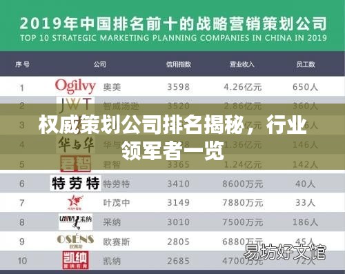 就是知名策劃公司的排名,這些公司在行業內具有廣泛的影響力,憑借專業的團隊、豐富的經驗和精湛的技能,為企業提供全方位的策劃服務,除了這些公司,還有許多其他優秀的策劃公司也在為企業的成長和發展提供助力,希望本文能為您提供有價值的參考,幫助您在選擇策劃公司時做出明智的決策。